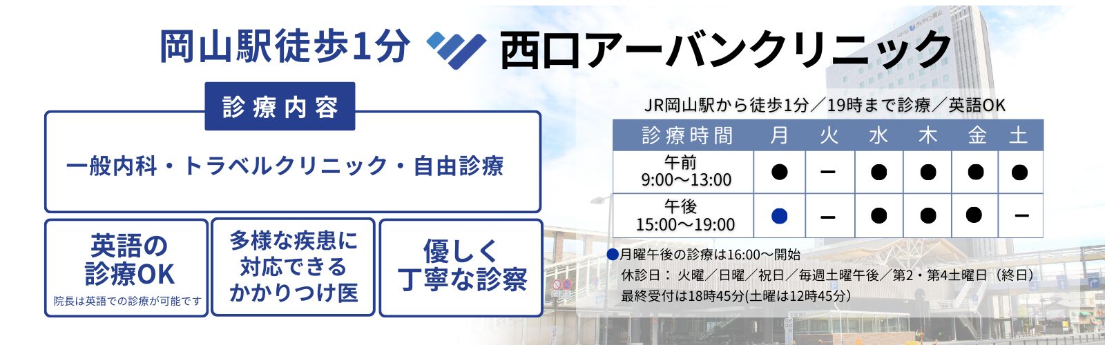 当院は岡山駅西口徒歩1分という駅近の便利な場所にあり、診察時間を19時までと遅い時間まで診察しています。仕事や学校帰りに通院しやすいので、忙しい方でも無理なく健康管理を続けることができます。通勤通学でバスや電車を利用されている方は出勤前後に気軽に受診できる場所にございます。