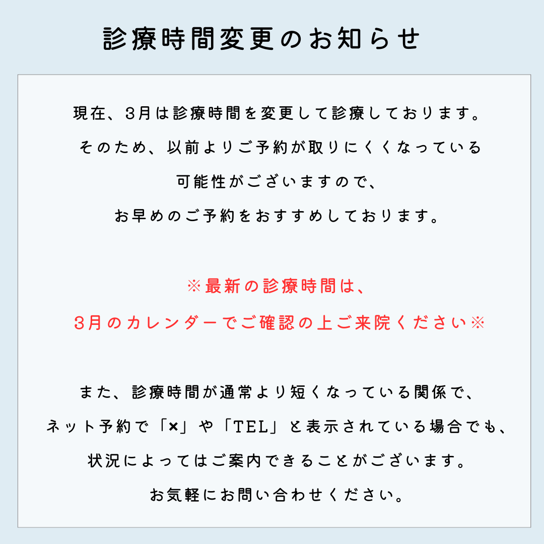 - 【3月5日(木) 診療時間変更のお知らせ】令和8年3月5日(木)の診療時間の変更のお知らせです。急なお知らせとなり誠に申し訳ございませんが、何卒ご理解賜りますようお願い申し上げます。 皆様にはご不便ご迷惑をお掛け致しますが、よろしくお願いいたします。