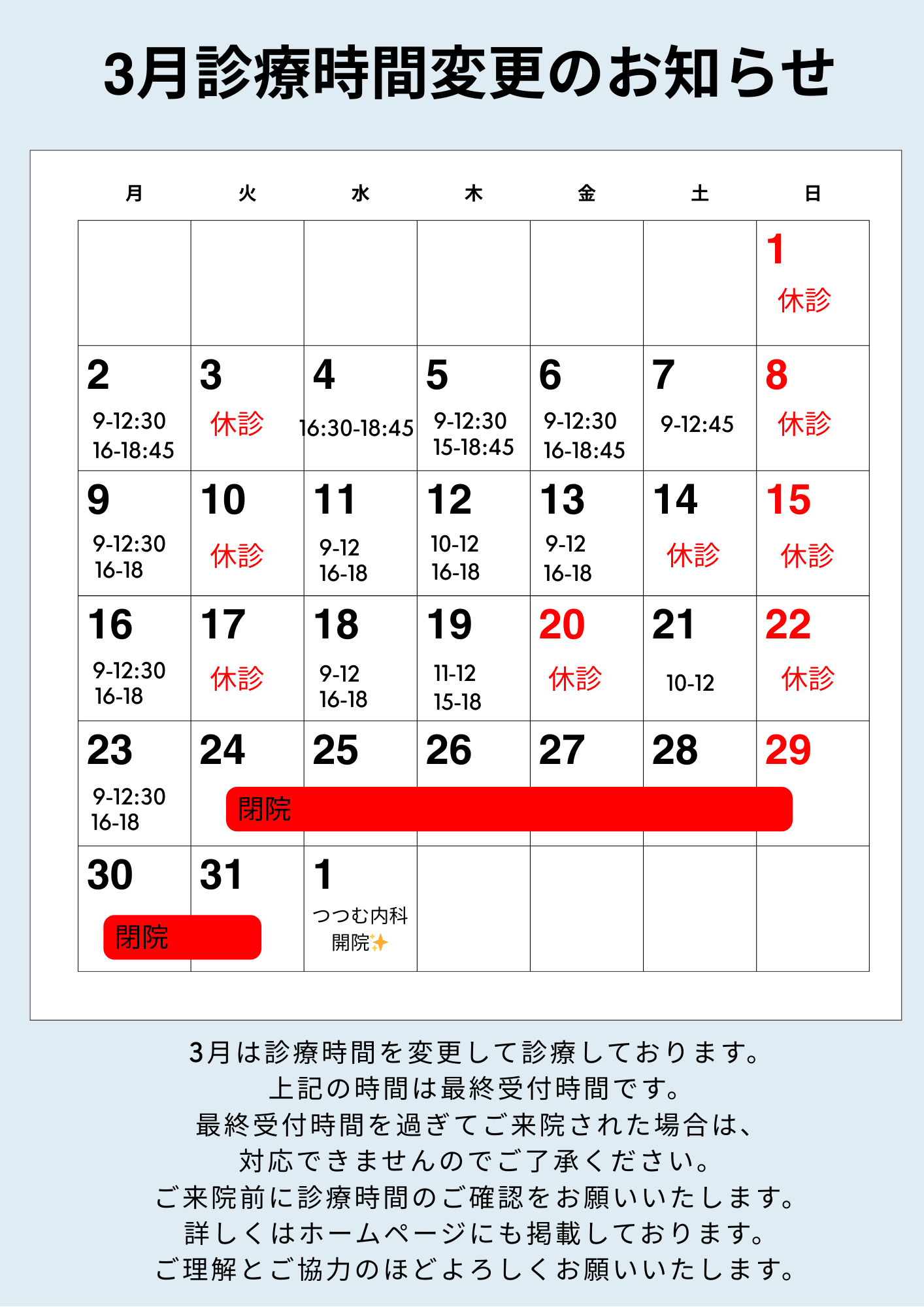 - 【令和8年3月 診療日・診療時間変更のお知らせ】いつも当院をご利用いただきありがとうございます。 令和8年3月の診療日は上記の通りです。 先日お知らせいたしました通り、当院は3月23日(月)をもちまして閉院いたします。 そして、4月1日より同じ場所にて「つつ […]