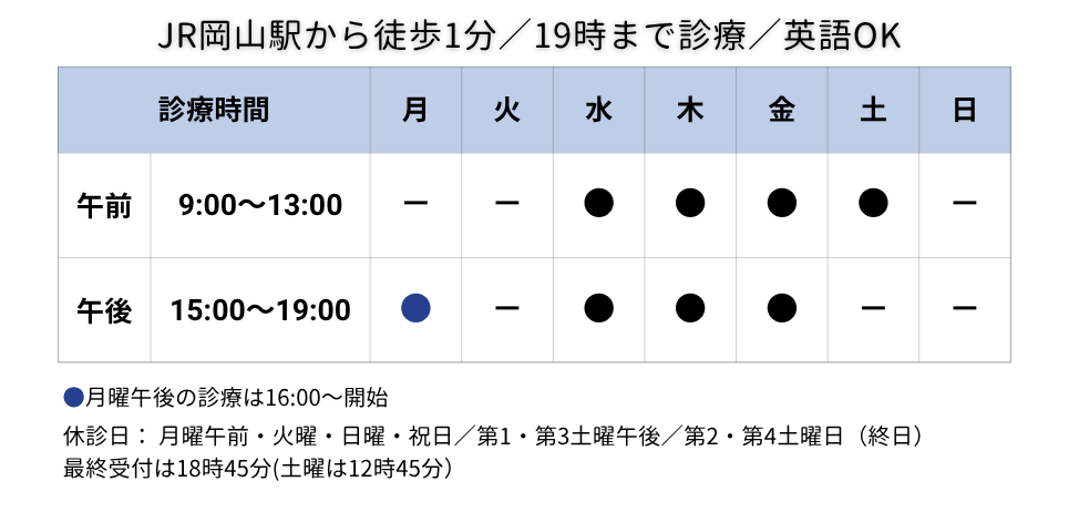 当院は岡山駅西口徒歩1分という駅近の便利な場所にあり、診察時間を19時までと遅い時間まで診察しています。
