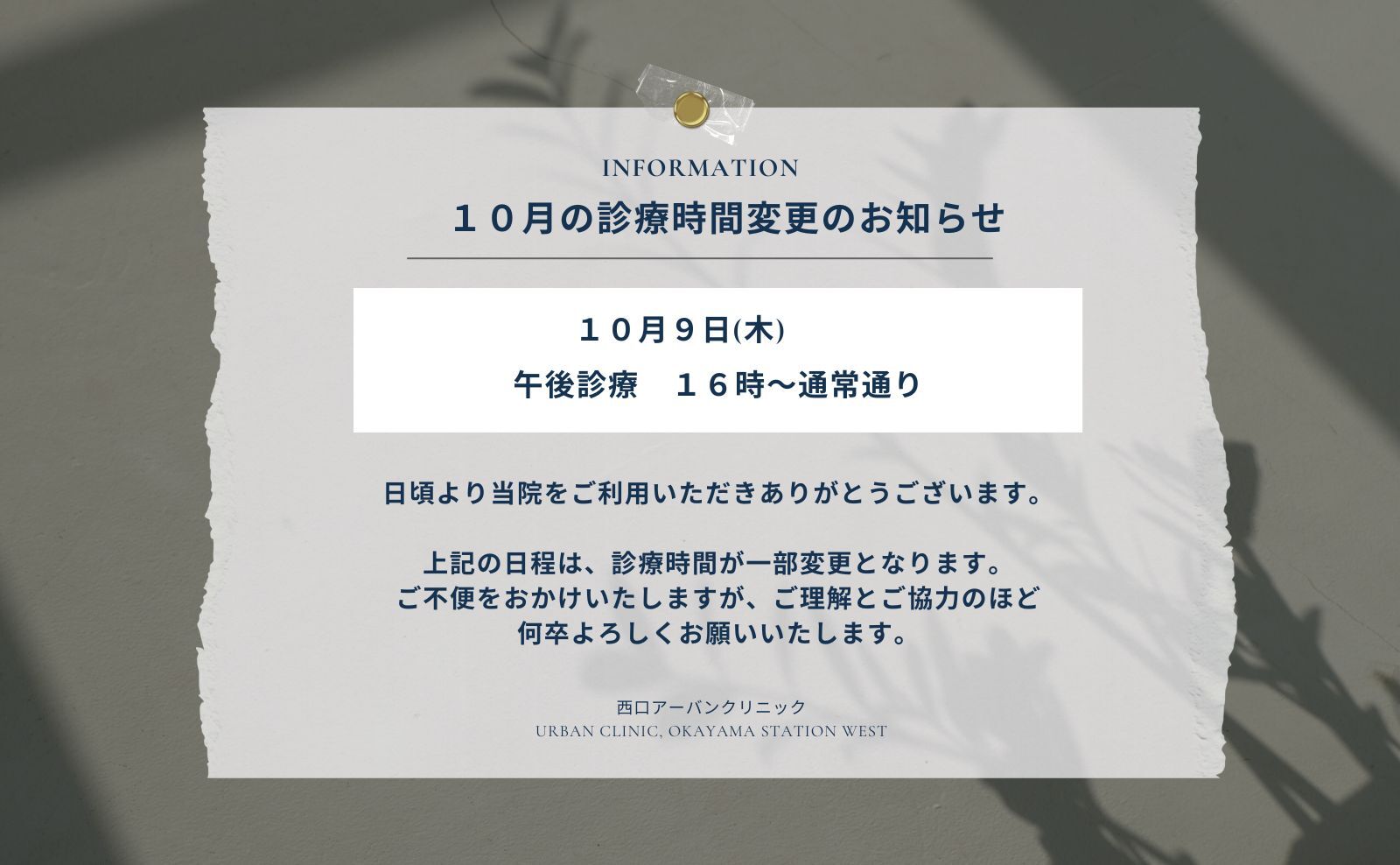 【10月9日(木) 診療時間変更のお知らせ】 2025 10/08 お知らせ 2025年10月8日 令和7年10月9日(木)の診療時間の変更のお知らせです。急なお知らせとなり誠に申し訳ございませんが、何卒ご理解賜りますようお願い申し上げます。 皆様にはご不便ご迷惑をお掛け致しますが、よろしくお願いいたします。 お知らせ この記事が気に入ったら フォローしてね! Follow Me よかったらシェアしてね! URLをコピーしました! URLをコピーしました!