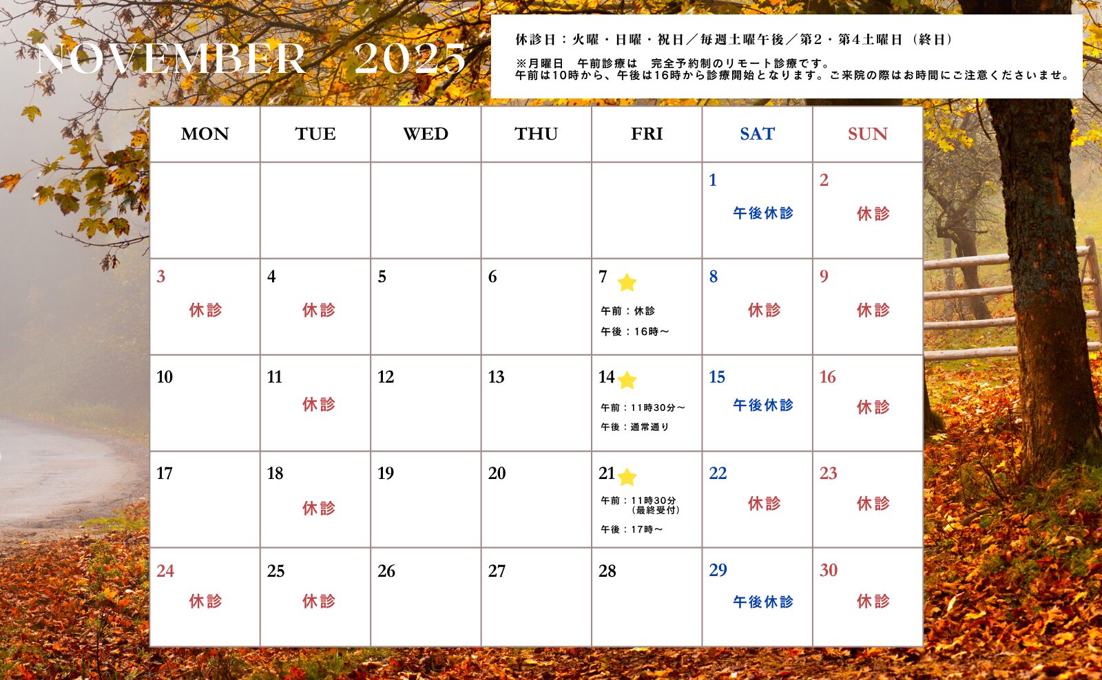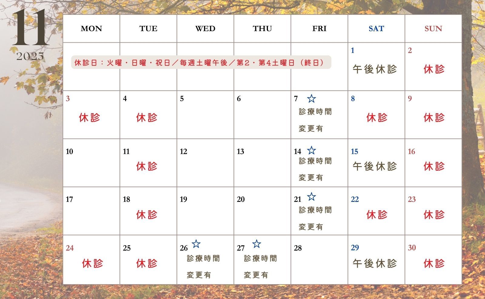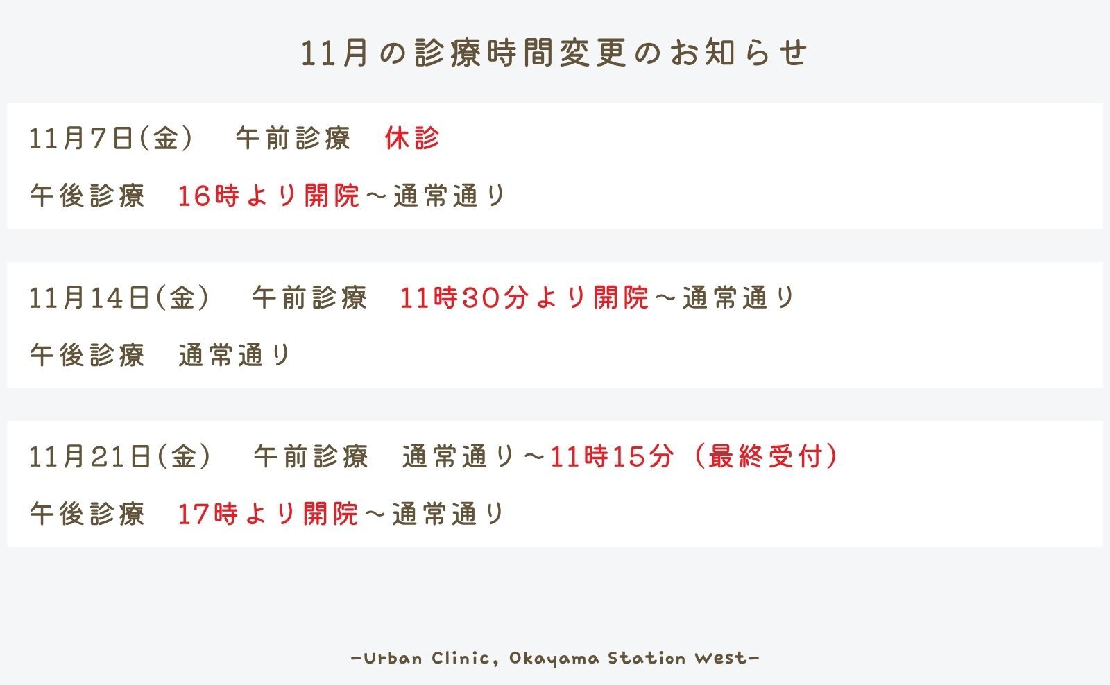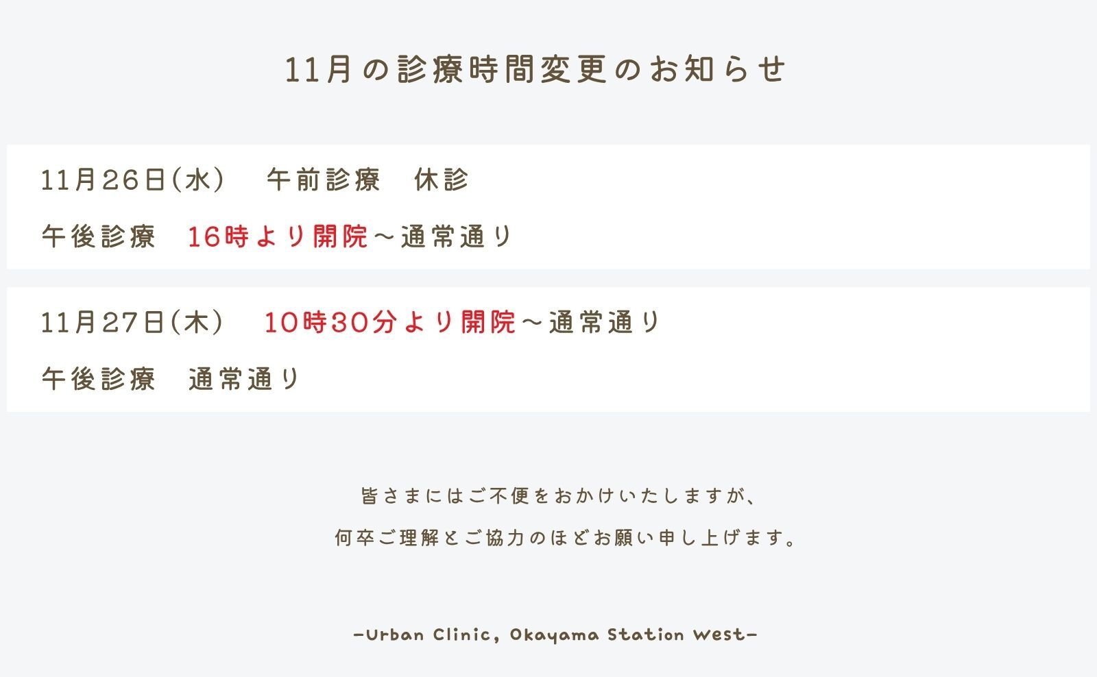 【令和7年11月 診療日・診療時間変更のお知らせ】 2025 11/01 お知らせ 2025年11月1日 いつも当院をご利用いただきありがとうございます。 令和7年11月の診療日は上記の通りです。 一部診療時間変更がございますので、ご確認のうえご来院ください。 今後ともよろしくお願いいたします。 お知らせ この記事が気に入ったら フォローしてね! Follow Me よかったらシェアしてね! URLをコピーしました! URLをコピーしました!