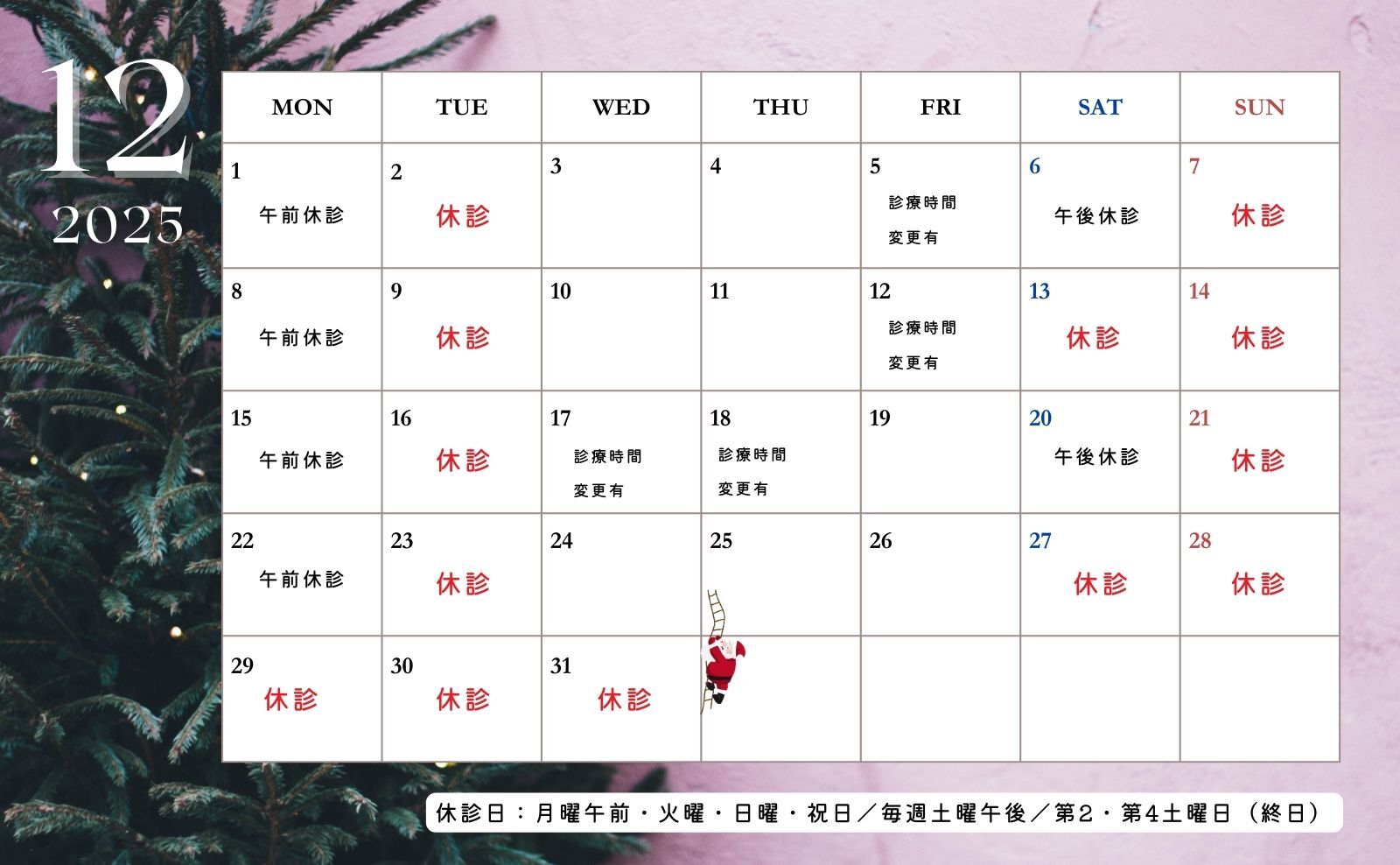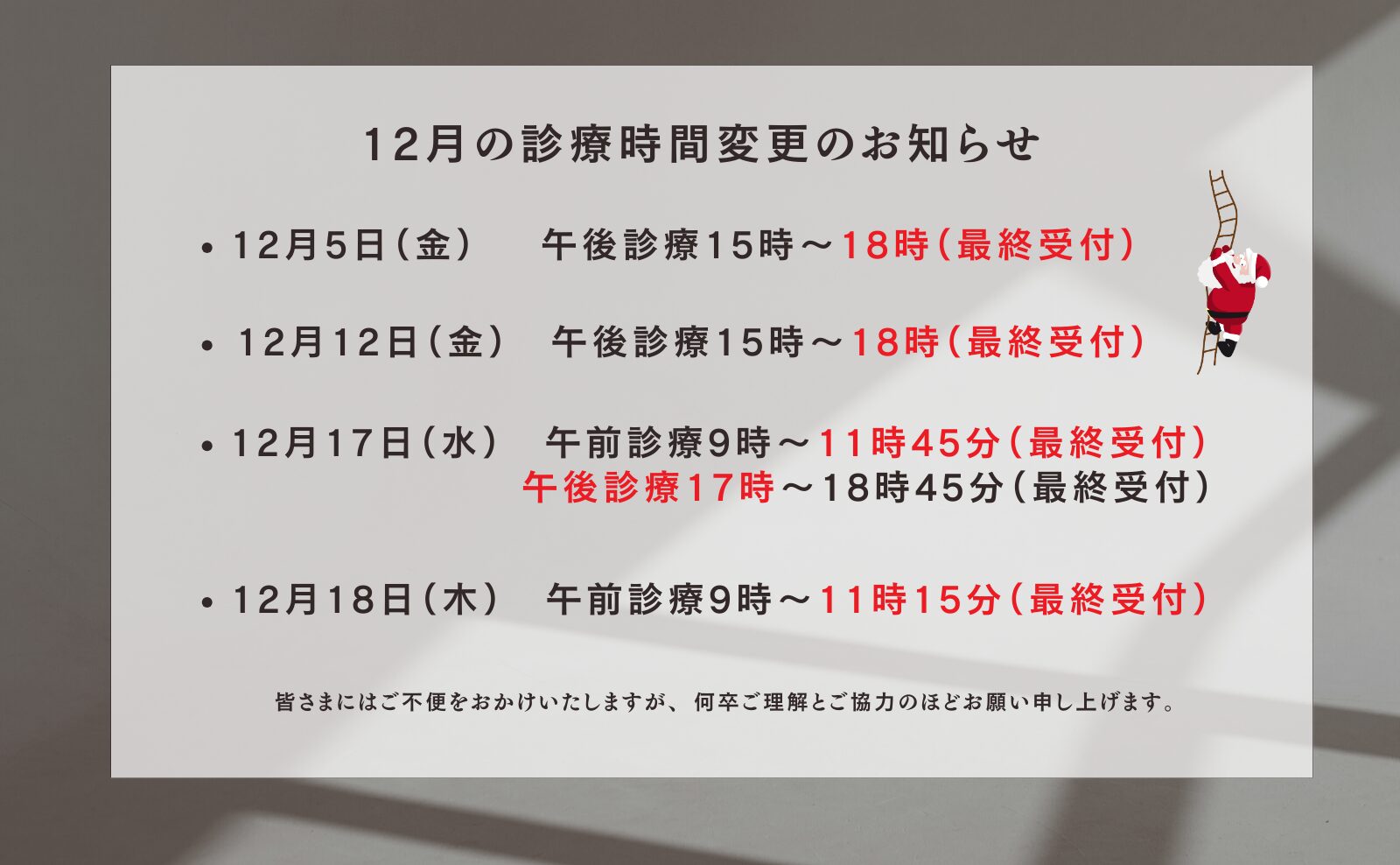 【令和7年12月 診療日・診療時間変更のお知らせ】 2025 11/29 お知らせ 2025年11月29日 いつも当院をご利用いただきありがとうございます。 令和7年12月の診療日は上記の通りです。 一部診療時間変更がございますので、ご確認のうえご来院ください。 今後ともよろしくお願いいたします。 お知らせ この記事が気に入ったら フォローしてね! Follow Me よかったらシェアしてね! URLをコピーしました! URLをコピーしました!