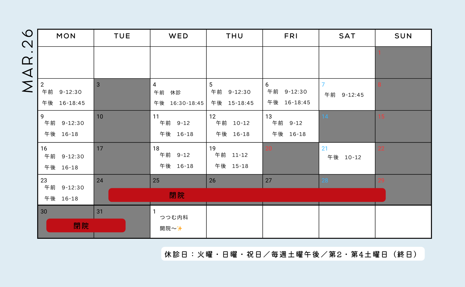 いつも当院をご利用いただきありがとうございます。 令和8年3月の診療日は上記の通りです。 先日お知らせいたしました通り、当院は3月23日(月)をもちまして閉院いたしま... -