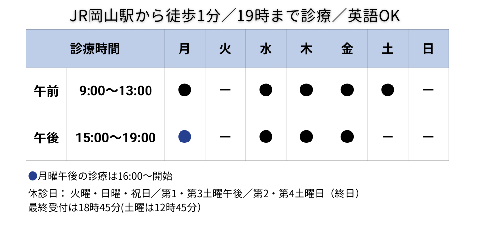 平日は夜19時(最終受付18時45分)まで診療を行っており、仕事や学校の後でも無理なく受診いただけます。通常のクリニックが閉まっている時間帯でも対応しており、急な体調不良や忙しい日々にも安心してご来院いただけます。